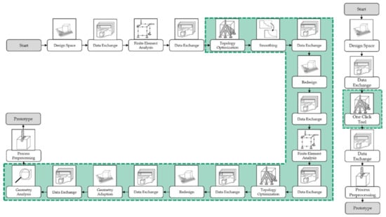 The visualization of the presented one-click optimization approach. The one-click tool aims to re-place and to widely automate the steps of topology optimization, smoothing, data exchange and redesign and finite element analysis, which are shown inside the green shaded area.