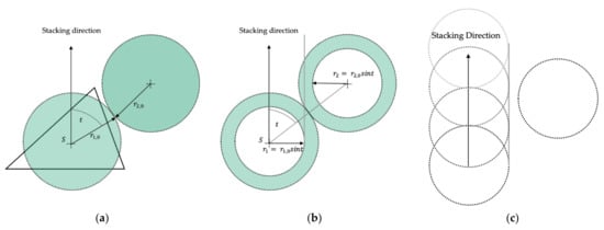The concept of finite spheres means a useful manufacturing constraint for casting processes and AM as it describes and solves manufacturing conflicts []. For the implementation of the concept of finite spheres to the TO problem, we assumed that every element has a physically reasonable volume. Then, each element was abstracted by a sphere with an identical center of gravity and volume . Therefore, the effective radius of the sphere for element is: