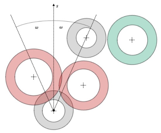 with a tolerance angle . The tolerance angle is a solely technical tool which was used later to describe a manufacturing conflict. Basically, the idea is not to evaluate the elements but the finite spheres if they have manufacturing conflicts. A manufacturing conflict is defined here as two spheres with overlapping radii. In the context of casting processes, this describes an undercut. Hence, the tolerance angle can be used to specify that an overlapping only occurs, if two spheres encounter in an angle below . Therefore, the effective radius of the spheres was adapted as shown in Figure 3.