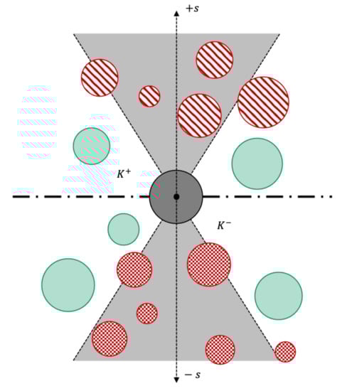 Visualization of the conflict cones in the positive (+s) and negative (−s) direction. Conflict spheres in red and conflict-free spheres in green. The conflict spheres in the positive direction are stored in K+, while the conflict spheres in negative direction are stored in K−.