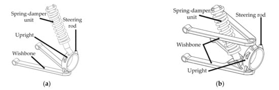 Most modern production road cars use directly actuated shock absorbers and coil springs either by a MacPherson strut or a multilink suspension [,]. Two typically used systems are shown in Figure 7. Directly actuated refers to a one-to-one motion ratio of the coupled suspension-link and the spring-damper unit.