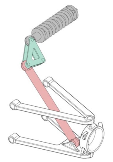 In general, car suspensions link the upright (or knuckle) assembly with the car’s body []. The upright assembly’s main parts are the wheel bearings, wheel hubs, brake calipers, and the suspension’s fastening points; these are attached to the car’s body by different types of links. The complexity and type of the links often vary with car pricing or comfort aspects [].