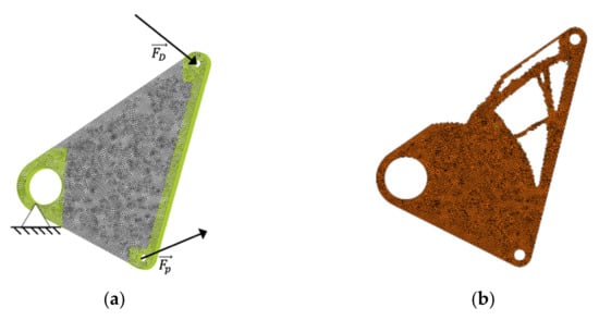 In modern product development, the sustainability and performance of the parts are more critical than ever. Simultaneously produced products are desired to be personally optimized for customers’ needs. Topology optimization (TO) is one of the leading computer-aided engineering (CAE) tools for structural optimization [,,]. In recent years, TO has reached a certain maturity and is a well-established research field [,] and is also used in many industrial fields [,], such as structural and civil engineering [,], mechanical engineering [,,,] or aeronautical engineering [,,].