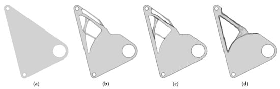 TO determines the optimal material distribution in a design space under defined loads and constraints. After [], today’s TO approaches can be classified into density methods, level set methods, phase field methods, and topological derivates. Existing algorithms can be clustered into mathematical and empirical approaches. An overview can be found for instance in [,]. New methods are shown in [], for instance, where neural networks are directly used in TO as an alternative to the commonly applied solid isotropic material with penalization (SIMP) approach. Today’s research in TO is often linked with additive manufacturing (AM) since its freedom of design is almost essential for fabricating topology-optimized structures [,,,,,,]. The exploitation of lattice structures or graded porosity is of high interest in many cases [,,]. Nevertheless, the interpretation of the optimization result and its transformation into a parametric CAD geometry is still challenging. Approaches to solving this problem can be found, for example, in [,,].