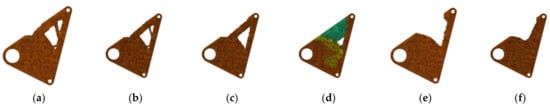 In this article, the previously described formulation of manufacturing conflicts improves the obtained design proposals’ direct manufacturability. The manufacturing rate controls the strictness of the manufacturing conflicts. As avoiding support at all costs is not always a goal-orientated approach, the manufacturing conflict rate is modified in the range of 0.5–1.0 to determine the appropriate manufacturing rate for the given application example. The results are given in Figure 13.