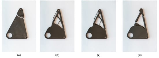 Printed and tested specimens: (a) reference; (b) redesigned; (c) smoothed; and (d) MaSmo.