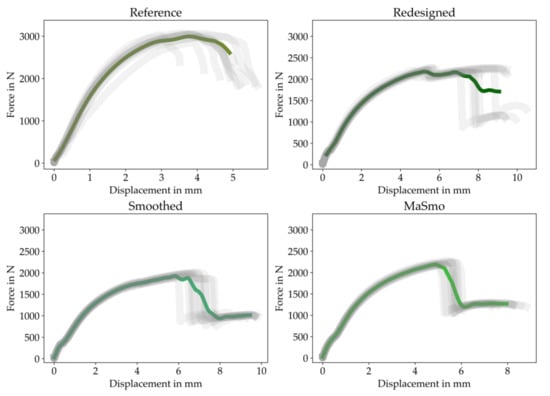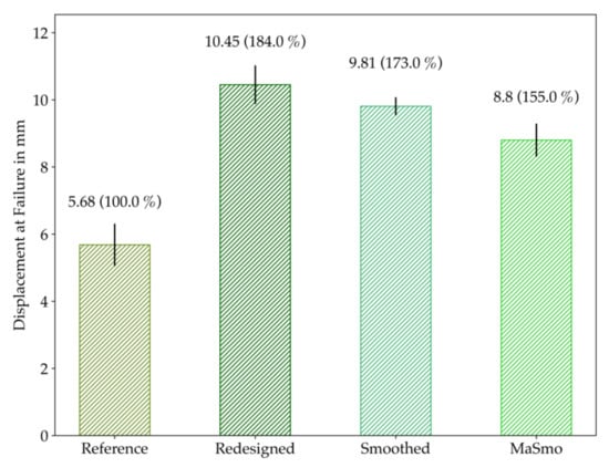 In general, it can be observed that the displacements at failure and maximum force are on the same level for redesigned and smoothed, whereas the values for MaSmo are the lowest for the TO-configurations. The high standard deviation of redesigned is also to be emphasized here.