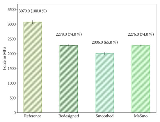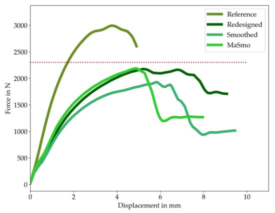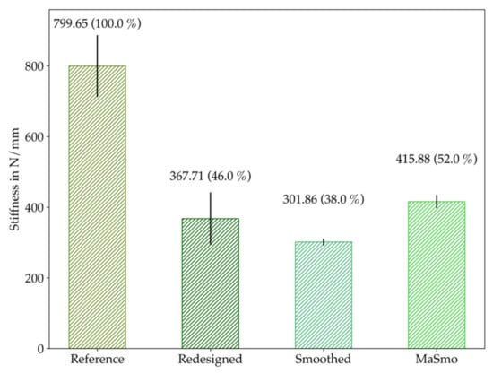 The used test setup in Figure 10 is an abstracted critical load case for the presented application example. Due to this fact, the chosen setup is qualified to evaluate the various configurations’ mechanical performances. Regarding the testing results in Figure 16, it is important to stress that the MaSmo configuration was the least noisy. In addition, MaSmo and redesigned are comparable and both better than smoothed in terms of maximal forces. Since the used TO approach is a hybrid optimization for stiffness and strength, it is assumed that TO configurations can bear about 75% of the reference’s maximum force, which is met quite accurately by MaSmo and Redesigned with 74% of the maximum force. In terms of stiffness, compared in Figure 21, the “one-click” optimized MaSmo configuration shows the best result, which corresponds to 52% of reference’s stiffness.