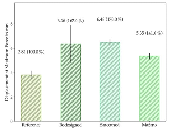 Comparison of the displacement at maximum force. The mean values are plotted together with the standard deviation. The difference from the reference is written in brackets in percent.