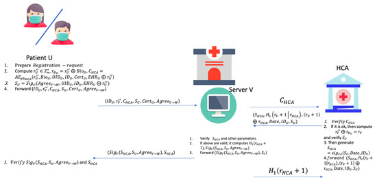 - In the migration registration phase, the simulator generates the corresponding hashed value to U and V. It prepares the for the patient U as the registration token. At the same time, the simulator chooses and makes the ciphertext for .