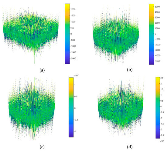 The Second Law of Thermodynamics is concerned with the direction of natural processes. This law states that an isolated and closed thermodynamic system can spontaneously evolve towards thermodynamic equilibrium, where its disorder degree (which can be measured by entropy) is at maximum [22,23,24]. Inspired by this law, we can assume that a DEM could be considered an isolated and closed thermodynamic system where pixels are taken as gas molecules. Different temperatures (i.e., different encryption techniques or same techniques with different initial parameters) are imposed on the same thermodynamic system (an image), and then, the gas molecules (pixels) move in different directions and finally reach one type of status. Figure 2 shows different statuses of a closed thermodynamic system under different temperatures. The disorder of the thermodynamic system represents the complexity (randomness) of an image. The gas molecules move in different directions and then form different distributions. The disorder degree of gas molecules increases from (a) to (d).