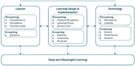 How could DML be facilitated in reality? Both deep learning and meaningful learning theories confirm that quality learning experiences activate students’ minds, hearts, and interpersonal communication skills [,]. DML achievement is a challenge in all educational settings considering that the key stakeholder of the learning process is each and every learner with his/her unique characteristics and mental and emotional capacities []. Educational institutions and knowledge providers, through their teaching and administrative staff, need to design and implement multi-faceted quality learning experiences that enable deep learning. Information and communication technology could support meaningful learning when the it is used for knowledge construction, conversation, articulation, collaboration, and reflection [].