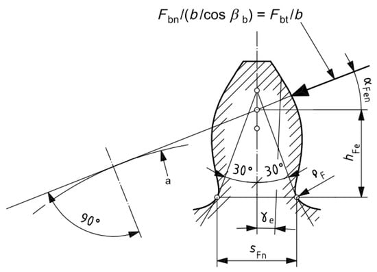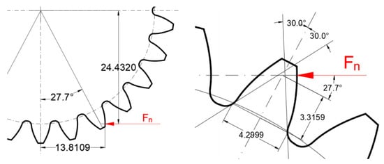 This force can be converted into a permissible stress , equal to the actual one , using the abovementioned formulas (ISO 6336). For the specific geometry, the form factor and the stress correction factor result, respectively, in 2.0298 and 1.9011. The values of (3.3159 mm) and (4.2999 mm) for the calculation of were graphically extracted (Figure 3).