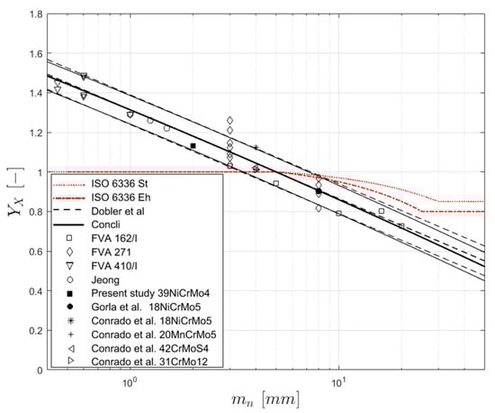 It is interesting to notice that, according to the model proposed by Dobler et al., based on several results available in the literature, for modules over 5 mm the load-carrying capacity for tooth root bending decreases. The actual formulation of the standards (ISO 6336 and DIN 3990), in turn, does not fit the experimental observed behavior ( referred to the Eh curve).