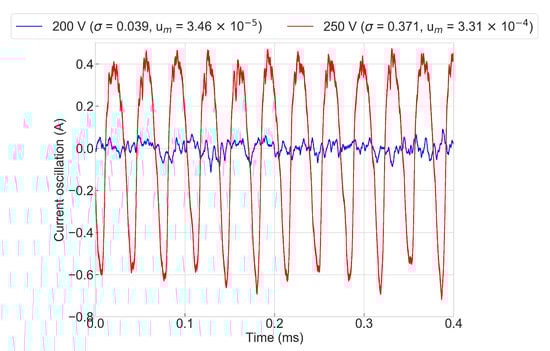 Discharge current oscillation when the thruster fires at 0.66 A, 200 V (blue) and 250 V (red). For both curves, the standard deviation () and uncertainty averaged () over the whole data sample is given.