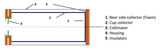 In this study, FCs with collimator diameters of 10, 7, 5, 3 and 1 mm have been built. A large orifice collimator minimizes the impact of the neutral gas inside the cup. As a FC is collimated, the collection solid angle is below 2, contrary to a planar probe, therefore a fraction of the thermal ion current is not captured [16,17]. Nevertheless, a collimator has a key role to define the velocity vector of ions entering the device. Moreover, the collimator also limits the ion flux, which avoids saturation of the measurement signal when the FC is placed in the center of the ion beam, especially for high-power EP devices. A schematic view of the FC is shown in Figure 4. The FC assembly is composed of 5 different parts.