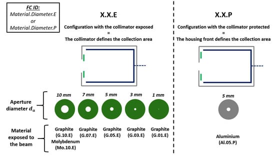 Figure 5 displays the different designs tested in this work. To prevent confusion a nomenclature (ID) is used to refer to a specific FC design. The ID is split into three parts (). The first component gives information about the material used to equip the front of the FC. It can be either G, Mo, or Al which respectively correspond to graphite, molybdenum and aluminum. The second component refers to the diameter of the inlet aperture. Therefore, one can have numbers 01, 03, 05, 07 and 10. Finally, the last part of the ID indicates information whether the collimator is exposed to or protected from the beam, using the letter E and P respectively. So, designs labelled differ from designs as the housing aperture diameter decreases while the collimator diameter behind becomes larger. Please note that with configuration the collimator can be grounded or biased while in configuration the latter is always grounded (see Section 6.3). As an example, the FC corresponds to a collimator made of graphite with an aperture diameter of 7 mm and is exposed to the beam.