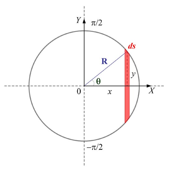 The ion current density (A/m) is assumed to be collinear to the outward pointed unit normal vector to the surface. A spherical coordinate system is often used to determine and compute . The probe is usually fixed at a distance R and the thruster is supposed to be a point source at the center of a sphere. To compute it is needed to know , where is the latitude and the longitude. When the current density is solely recorded in a plane that contains the thruster axis, e.g., following the angle from to , one can assume a cylindrical symmetry of the ion beam around the thruster axis to determine and compute . It is in fact easier to use a cylindrical coordinate system to solve Equation (2). In that case the coordinate system is depicted in Figure 7 along with the elementary arc . The thruster exit plane points toward the x axis. Measurements are performed at a fixed distance R and defined by the angle . Cylindrical symmetry implies a constant inside the element with radius y and thickness . The sum of these elements, each weighted with , gives the ion current: