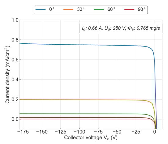 In the second part of the experiment four different potentials (−15 V, −25 V, −50 V and −75 V) have been applied to the collimator in the FC configuration Al.05.P. I–V curves at = 0° are plotted in Figure 15. One can notice all I–V curves are relatively flat when the FC potential is below −100 V. As mentioned in previous studies [73] SEE is characterized by a drop of ion current when the potential applied to the collector is higher than the electrode placed at the entrance of the FC (housing, collimator). Such behavior is not observed in Figure 15, which confirms the choice of FC architecture to suppress SEE.