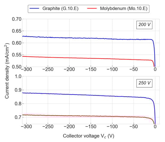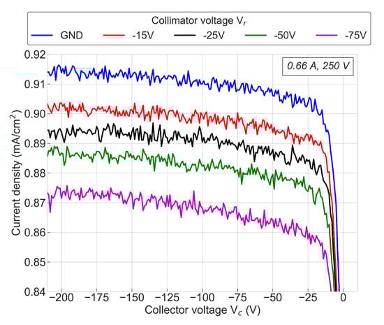 Figure 16 shows I–V curve with a voltage sweep applied to the collimator while the collector is grounded, the current density measured on the collimator increases when the voltage applied is more negative. This trend is characteristic for I–V curves of Langmuir and non-guarded planar probes [16]. The collimator is a simple disk electrode with no specific design to reduce SEE. Moreover, sheath expansion effect is no longer negligible. This results in an artificial ion current increase as displayed in Figure 16.