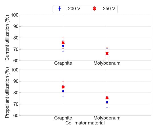 The total ion current is obtained from the current density profile as explained in Section 4.1. We use Equations (6) and (8) to obtain the current and propellant use. Figure 10 shows the value of and for two thruster operating conditions and two FC configurations. Both parameters are lower for the molybdenum collimator configuration. The difference remains true whatever the thruster discharge voltage with constant discharge current. For the two configurations is larger at 250 V because the ionization degree increases with voltage. Numerical simulations are used in Section 6.1 to discuss the behavior observed experimentally.