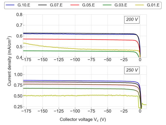 Here, the collection solid angle of the FC is modified using five grounded graphite collimators with different aperture diameters (d): 10 mm (G.10.E), 7 mm (G.07.E), 5 mm (G.05.E), 3 mm (G.03.E) and 1 mm (G.01.E). The length of the cup is 50 mm. On-axis I–V characteristics are displayed in Figure 11. At = 200 V, the current density measured by G.01.E is constant until 100 V then it starts to rise. This behavior remains so far unexplained. At higher discharge voltage I–V curve measured with G.01.E is more unstable than the other curves. With a diameter of 1 mm the probe alignment with the thruster axis is difficult. A slight deviation of the probe pointing vector can lead to a large decrease in the measured ion current. Misalignment could then explain the different behavior observed between 200 V and 250 V. Figure 11 indicates the current density decreases when the collimator diameter is reduced.