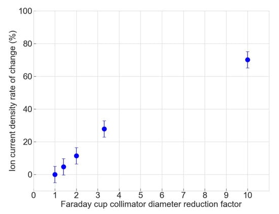 Narrowing down the inlet aperture of the probe can prevent some thermal ions from being collected; however, the ion thermal current is small in the ISCT200 plasma plume [70]. Additionally, the drop in current does not vary linearly with the reduction of the collimator diameter. Figure 12 shows the rate of change of the current density for different collimator diameters factor of reduction. It refers to the aperture diameter diminution compared to a 10 mm diameter (). The Hall thruster fires at 250 V and 0.66 A. We observe a linear increase of the current density until a factor 6. After, the rate of change slows down and reaches a maximum when the diameter of the collimator is reduced by a factor 10.