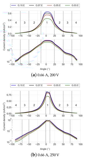 Figure 13a,b show the beam profile of the HT for 200 V and 250 V at constant . The double peak shape visible on the thruster axis is due to the annular geometry of HTs. It is better seen at high voltages. Note when operated at 200 V and 0.66 A the thruster plume has instead a rounded shape. At this power level the thruster operates with a low efficiency. As can be seen in Figure 13, we observe four distinct zones, unrelated to the probe design and characteristic of the Hall thruster plume. For a given zone the differences observed between each profile is due to the probe configuration. The zone width depends on the thruster discharge voltage. Each zone is defined by a sharp change in current density slope. Zone 1 depends the most on the thruster operation. Indeed, we note that at 200 V zone 1 lies between −15° and 24° while at 250 V the zone width does not exceed 12°. This is due to the thruster performance. Indeed, at 200 V the thruster ionization process is not optimal which implies that ions travelling on the thruster axis have broader energy distributions and their velocity vector deviates more easily from the thruster firing axis. Therefore, when the aperture diameter of the FC is reduced it diminishes the probability for an ion to reach the collector. In contrast, at 250 V the ionization is better which creates a more focus beam with narrower ion energy distributions. Therefore, zone 1 is narrower. Please note that within zone 1, a major current density drop is observed with FC G.03.E. Moreover, in this zone the current density rate of change between each FC configuration is constant between 200 V and 250 V. Eventually, zone 2, 3 and 4 are larger at higher discharge voltage. Zones 3 and 4 are usually referred to the Hall thruster wings. They contain most of the slow ions with random velocity vectors induced by CEX and scattering collisions [71]. Please note that other thruster design parameters such as electric field distribution and zone of the ionization contribute to Hall thruster wings [70,72]. The ion density decreases fast in the plume of Hall thrusters when moving away from the centerline. The change of slope between each zone becomes less visible at higher discharge voltage. At 250 V, the ionization process in the thruster channel is more efficient. Consequently, the ion population increases. When the of ion density increases the rate of CEX becomes higher in the thruster channel and within the plume. Therefore, these two processes contribute to enlarge the beam divergence angles by increasing the ion density in zone 4. Please note that the current ratio between the core and large angle wings can reach three orders of magnitude in HT plumes.