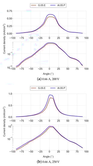 The beam profiles of the first study are displayed in Figure 14a,b (G.05.E and Al.05.P). At both discharge voltages Al.05.P measures the highest ion current density. On the thruster axis, the signal acquired by configuration X.X.P is 15 to 20% higher than X.X.E. The difference in current density is observed all over the beam profile. Actually, the current density decreases when the potential is more negative on the collimator. When the collimator is biased to −75 V, is near 5% less than the one obtained with a grounded collimator.