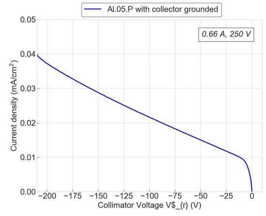 On-axis I–V curves acquired with design Al.05.P. A voltage sweep is applied to the collimator electrode while the collector is grounded. Thruster parameters are 250 V, 0.66 A, = 0.802 mg/s.