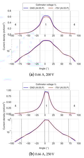 Figure 17a,b show the beam profile obtained with FC Al.05.P with the collector potential fixed at −50 V and the collimator grounded (blue) or biased at −75 V (red) with the thruster firing at 200 V and 250 V, respectively. Only zones 1 and 4 introduced in Section 5.3 with Figure 13a,b are plotted. These zones are the most influenced by the probe voltage configuration. Indeed, in zone 1 there is a non-negligible drop of the current density measured by the FC configuration with −75 V applied to the collimator. In contrast, in zone 4 the current density measured with V at −75 V overtakes the grounded collimator configuration. The lower signal measured by the −75 V configuration in zone 1 is caused by larger ion energy distribution, see Section 5.3. Low energy ions will tend to be directly or indirectly (Section 6.3) collected by the collimator. The higher signal in zone 4 is another clue for the presence of CEX within a Hall thruster plume. In this zone low energy ions with random velocity vectors caused by CEX are predominant. Therefore, they will be more sensitive to any potential drop in their vicinity, such as the collimator voltage (Section 6.3), and will be attracted [71]. Since with this configuration the collimator is placed behind the housing and the collector is biased to −50 V, they will be directed towards the latter.