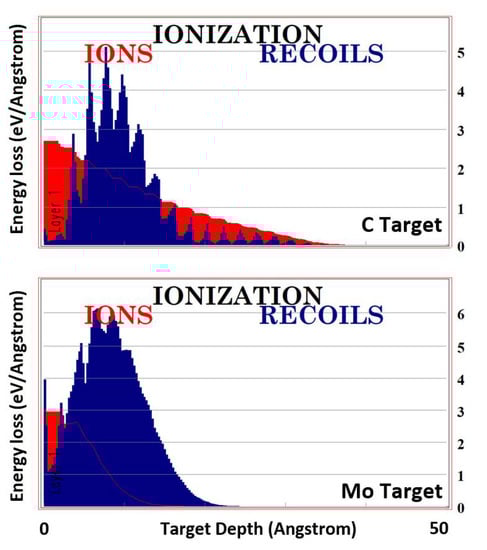 Experiments showed the influence of the material on the measured ion current. The software SRIM (Stopping and Range of Ions in Matter) was used to find the sputtering yield of Al, C (≡graphite) and Mo with Xe as the projectile. SRIM includes a group of programs which calculate the stopping and range of ions into matter. They use a quantum mechanical treatment of ion-atom collisions where projectile atoms are considered to be “ion” and target atoms as “atoms” [64]. Simulations that included 10000 singly-charged xenon ions were run to compute the yield and heat losses. The latter corresponds to the energy transferred by projectiles to the target materials and subsequently converted into heat. Figure 18 and Figure 19 show results for carbon (i.e., graphite) and molybdenum under singly-charged Xe ion bombardment. Simulation outcomes give an idea on how the target behaves under Xe ions bombardment.