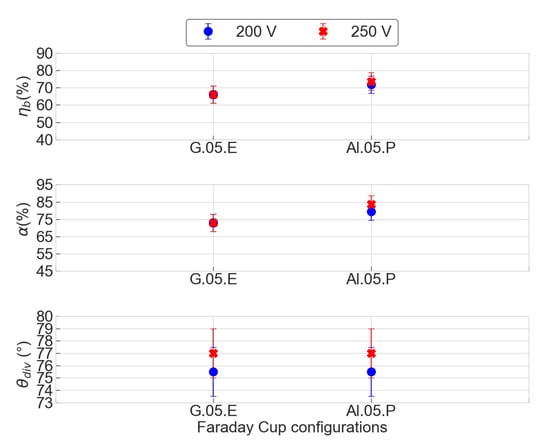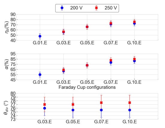 Parameters calculated from the ion current density measured by a FC are given considering uncertainties (u) from our measurements. The final uncertainty is always given for 95% confidence level (i.e., 2u). Therefore, the current and propellant use are given with ±5% interval and divergence angles with ±2° accuracy.