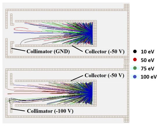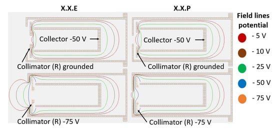 Figure 15 and Figure 16 suggest that applying a negative voltage to the collimator, prevents a part of the ion current to reach the collector. To better understand changes observed in the measured ion current density, simulations have been carried out with the SIMION software [74]. The outputs of numerical simulations are discussed in Section 6.3.