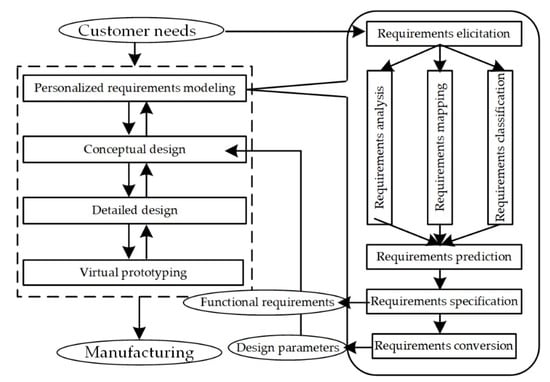 Nowadays, more than half of the industrial products are related to customization [1]. How to satisfy personalized customer needs (CNs) and how to efficiently design the customized products have been the important characteristics to evaluate manufacturing enterprises’ viability and competitiveness. There are four critical stages in product customized design [2]: personalized requirements modeling [3], conceptual design [4], detailed design (i.e., configuration in mass customization [5]), and virtual prototyping (including virtual experience [6] and simulation [7]), as shown in Figure 1. The first stage in the design process—personalized requirements modeling—is the foundation of product customization, including elicitation, analysis, mapping, classification, prediction, specification, and conversion. The process of requirements modeling is to transform CNs into functional requirements (FRs) and FRs into design parameters (DPs), where FR is the intermediate link [8]. FRs and DPs are then input into the design activities afterwards. If there is an error in FR, all the design activities in customization will be susceptible to a domino effect of defaults, which could undermine the final design schemes, lower customers’ satisfaction in experience, and cause redesign. Thus, focusing on the requirements modeling and dealing with the potential problems are imperative to product customized design.