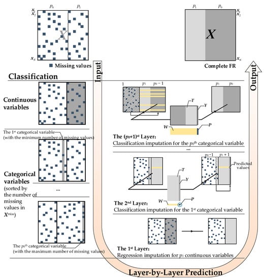 A multi-layer framework is presented in Figure 3. After classifying different data types in Xmiss, the complete X can be obtained by layer-by-layer prediction with two different imputation methods. The 1st layer is used for predicting missing continuous variables. We can choose one regression imputation method in the first layer. Then, the 2nd to the (p0 + 1)th layers in the framework are used for predicting categorical variables. For example, in the second layer, we have p1 continuous variables with complete values in X, denoted as , and the missing values of the first categorical variable will be predicted. The first categorical variable is defined as the ath column in with the minimum number K of missing values. is then separated into four parts: are the existing values in , are the corresponding values to the index of Y in , are the values in except T, and are the K missing values to be predicted. T and Y are used to train a classifier, and W is input into the trained classifier to predict the values in P, which is the predicted results of . There are p0 categorical variables in FR for prediction, and the number of layers in this framework is p0 + 1.