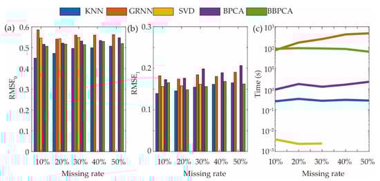 We run some of the most commonly used and state-of-the-art methods described in Table 1 to compare against KNN-SVM. The individual methods in this comparison are single methods, including KNN [24,25], BPCA [27], BBPCA [28], GRNN [26], and SVD [30], and composite methods, including KNN-SVD, KNN-GRNN, KNN-BBPCA, KNN with naive Bayes classifier (KNN-Bay) [38], KNN with decision trees model (KNN-Tree) [32], and KNN-SVM. The composite methods are all strengthened by the proposed framework. k = 10 is adopted in KNN in this case study.