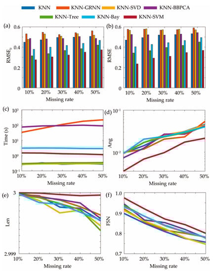 As shown in Figure 6, all three new classifiers are better than the original three composite methods. In detail, with the same method (KNN) predicting the continuous variables, KNN-SVM outperforms other methods in terms of RMSE as well as Ang, Len, and FSN. KNN-SVD and KNN-Tree are better than KNN-SVM in terms of computation time (Figure 6c), but KNN-SVM results in average reduction in RMSE of 46%, 39%, 30%, and 21% against KNN-SVD, KNN, KNN-Bay, and KNN-Tree, respectively (Figure 6b). SVM usually needs longer computation time for classification, which is its own short slab. Although the computation time is not the shortest, SVM is feasible in the real-world application with around 1.5 s for computation. With the missing rate increasing, the accuracy of prediction decreases, but the performance of similarity in KNN-SVM outperforms the others even in high missing rate. In the proposed framework, KNN-SVM is the most feasible method for practical application.