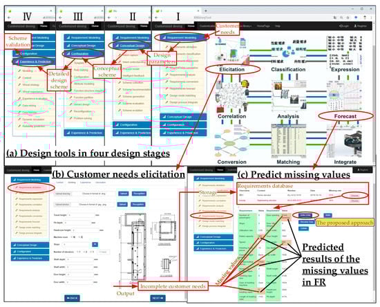We have developed a prototype system for elevator customized design based on Java and MySQL, as shown in Figure 7. This design platform has been applied in the elevator customization cooperated with Canny Elevator Co. Ltd. in China. There are four design stages in this design platform, as described in Section 1, and nine design tools in each design stage (Figure 7a). The proposed approach is packaged in the design tool, requirements forecast (Figure 7c), in the requirements modeling stage. In the real-world elevator customized design process, the design tool, requirements elicitation, captures customer requirements and outputs the incomplete CN to the requirements database. FR often has missing values due to incomplete CN, which effects the requirements conversion from FR to design parameters. Traditionally, managers fill in the missing values based on their own knowledge and experience. The imputation results may not fulfil individual customer requirements. After integrating the proposed approach in this design platform, managers can choose the order in the requirements database and view the missing parts in FR, and then automatically obtain the predicted results of the missing values, as shown in Figure 7c.