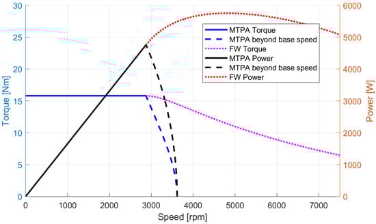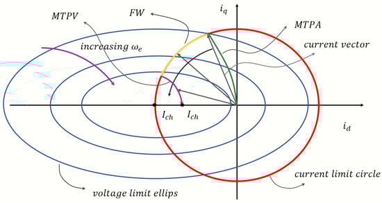 In the constant torque region, where the motor operates in the MTPA mode, limits are due the current limit circle see Equation (4) only. On the contrary in the constant power region they rely on both current and voltage limits Equations (4) and (5). The voltage limit circle becomes an ellipse in the plane, due to the rotor saliency, see Equation (6) where is the rotor mechanical speed [22].