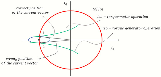 This working condition is critical, since the current vector must be kept ideally very close to the d-axis position 1, see Figure 3. In this operating point, even a small error in the electrical angle (e.g., due to the position sensor on the motor or to the delay introduced in the PWM period) could move the current vector from the motor operating region, position 1 of Figure 3, to the generator operation region, position 2 of Figure 3, producing unwanted additional braking torque or vibrations.