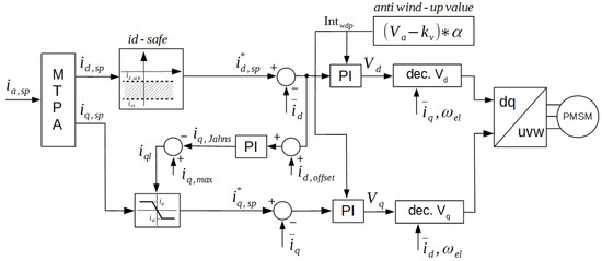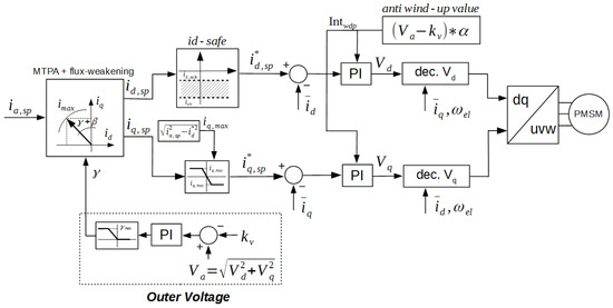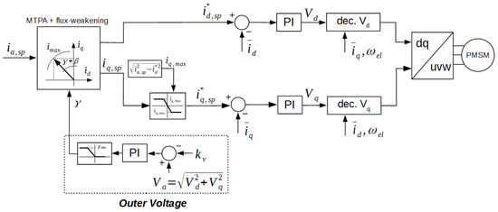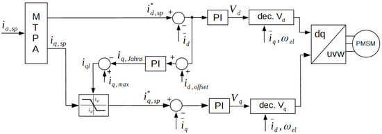 Figure 5 shows the FW control scheme proposed in [17]. In this paper, the setpoint of MTPA torque is transformed into the corresponding current setpoints in the d-q axis reference frame by function blocks. Then, setpoint is transformed from polar to rectangular coordinates: and .