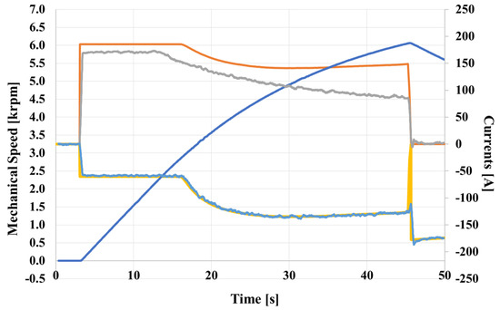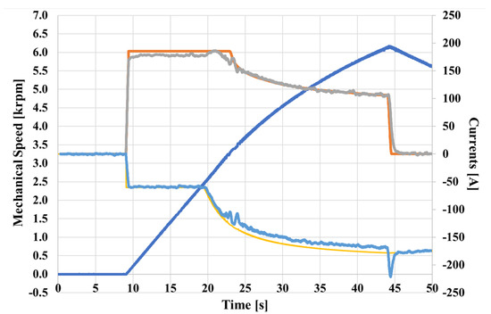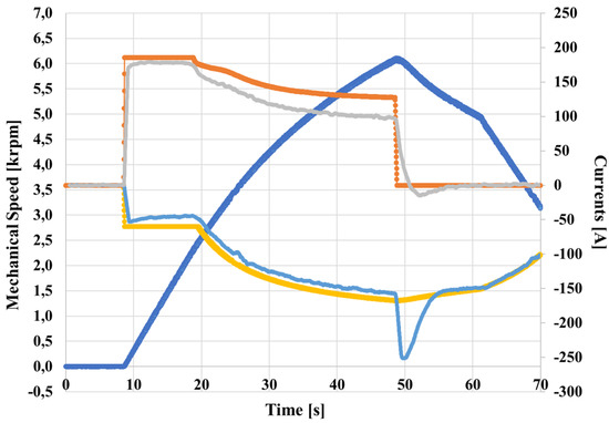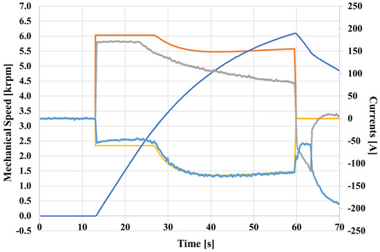 Experimental results of Jahns’ control [16]. Angular mechanical speed profile (blue solid line) and currents signals: setpoint (yellow solid line), motor (light blue solid line), setpoint (orange solid line) and motor (grey solid line).
