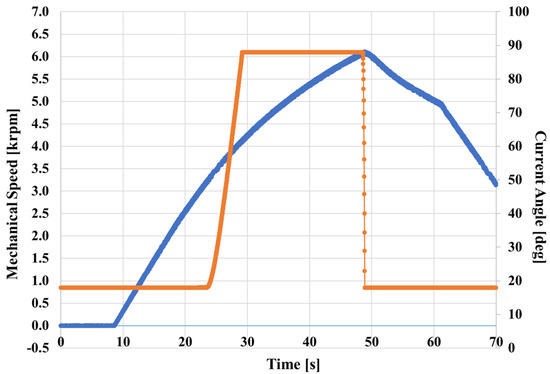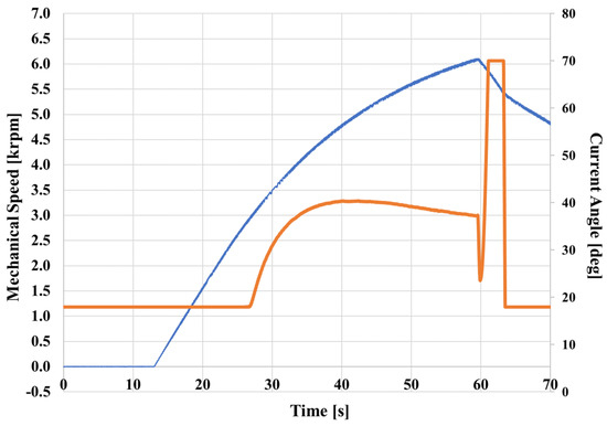 Experimental results of Jahns’ control [16]. Current angle (orange solid line) and angular mechanical speed (blue solid line).