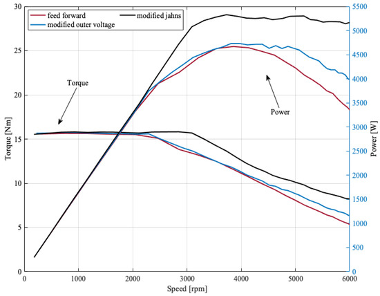 Figure 19 compares the experimental results of the feed-forward open loop approach. The enhanced outer voltage and the enhanced Jahns’ torques and powers are reported versus mechanical speed and it can be clearly noticed that the enhanced Jahns’ control strategy outclasses either FF method, or outer voltage method.