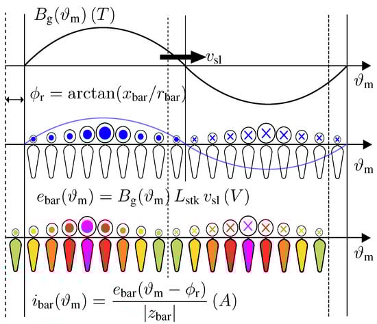 In such a case, only the first harmonic of air-gap flux can be considered, and spatial behavior of induced voltage and current, within the rotor bars, exhibits a sinusoidal waveform, as shown in Figure 1.