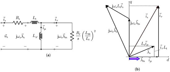 where and are the stator and rotor resistance; is the stator angular frequency. In the RFO model, the rotor current represents the torque current , which lies along the q-axis of the space vector diagram reference frame, Figure 2b. Introducing the transformation coefficient , stator and rotor currents are: