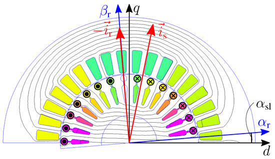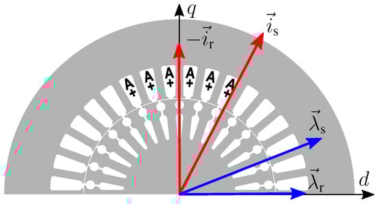 Let us impose the stator d and q-axis currents and assume the reference frame position as in Figure 3. The rotor current, according to the inverse-Γ model, is set along the q-axis, and its amplitude is given by relationship (8).