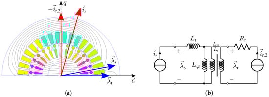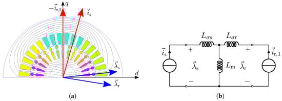 First simulation field solution and related equivalent circuit. The aim of the first analysis is the computation of motor parameters, considering the presence of under-load currents. (a) First MS FEA field solution, the imposed current density is shown; (b) equivalent circuit related to the first FEA. Stator and rotor leakage and magnetizing indictances are highlighted.