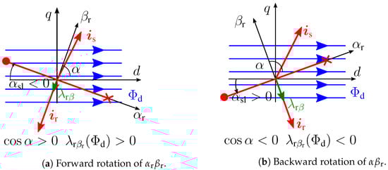 In Figure 8b, a forward rotation of the rotor and the winding is considered, which corresponds to . The angle between the axes and d is called , with